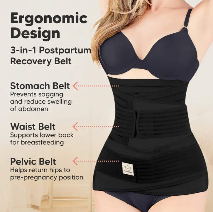 A 3-1 postpartum belt is a versatile support garment designed to aid recovery after childbirth. It typically features three main sections: a high-waist belt that helps to gently compress the abdomen and support weakened core muscles, a lower belt for pelvic support, and an optional back panel for additional lumbar support. The belt helps stabilize the pelvic region, reduce swelling, and improve posture while providing comfort and relief during the postpartum period. Made from breathable, stretchy materials, it adjusts easily to accommodate changes in body shape as you recover.